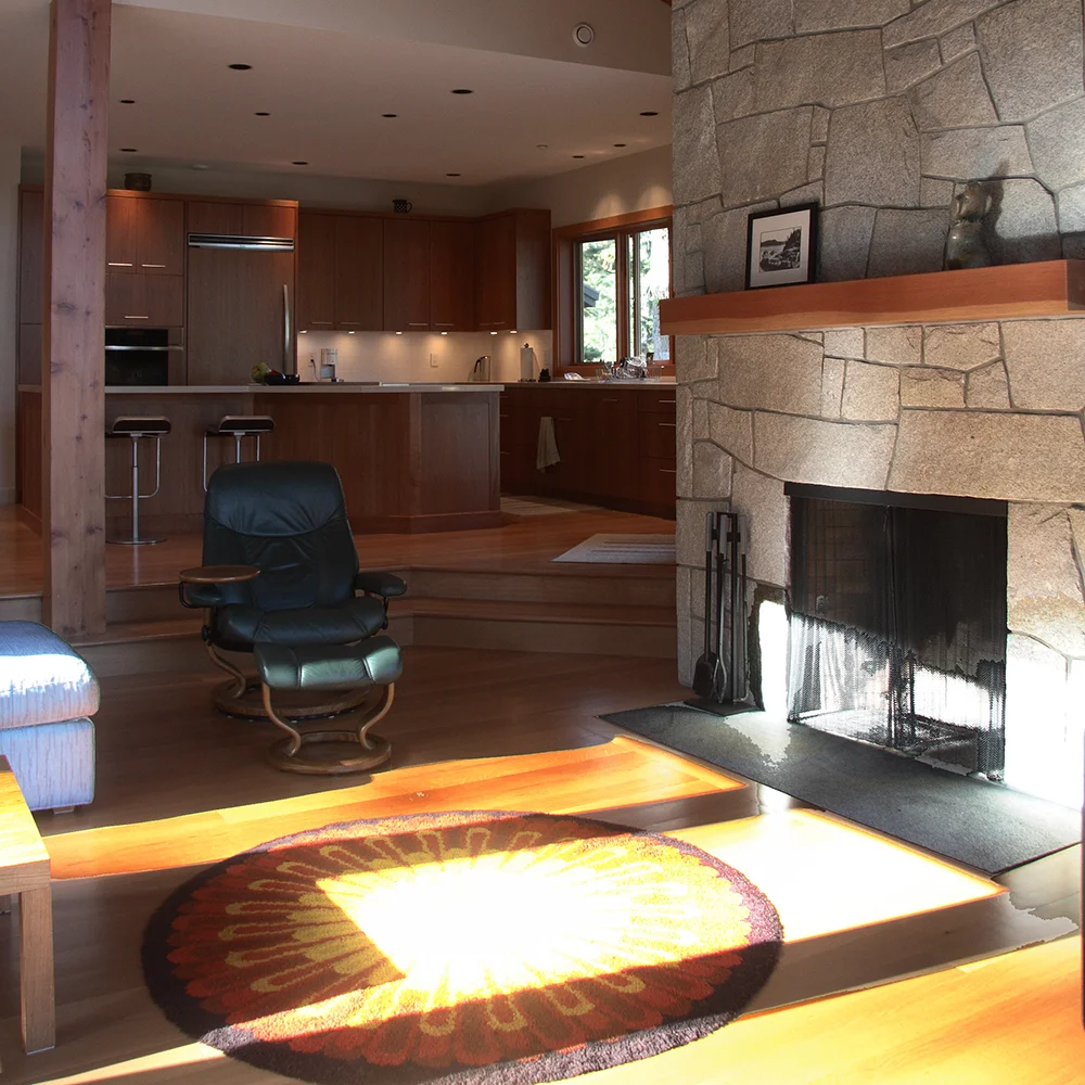 This 4000 sq foot home was designed by world renowned Architect 'Monty Wood'. The house is situated on a private island engulfed by marvelous waterfront rock scapes and dense forest. The Architect truly got the landscape and designed the house to take in 360 degree view of Secret Cove. Emitini was involved in exterior colours, interior spaceplanning, bathroom and kitchen design, lighting and all aspects of interior design.